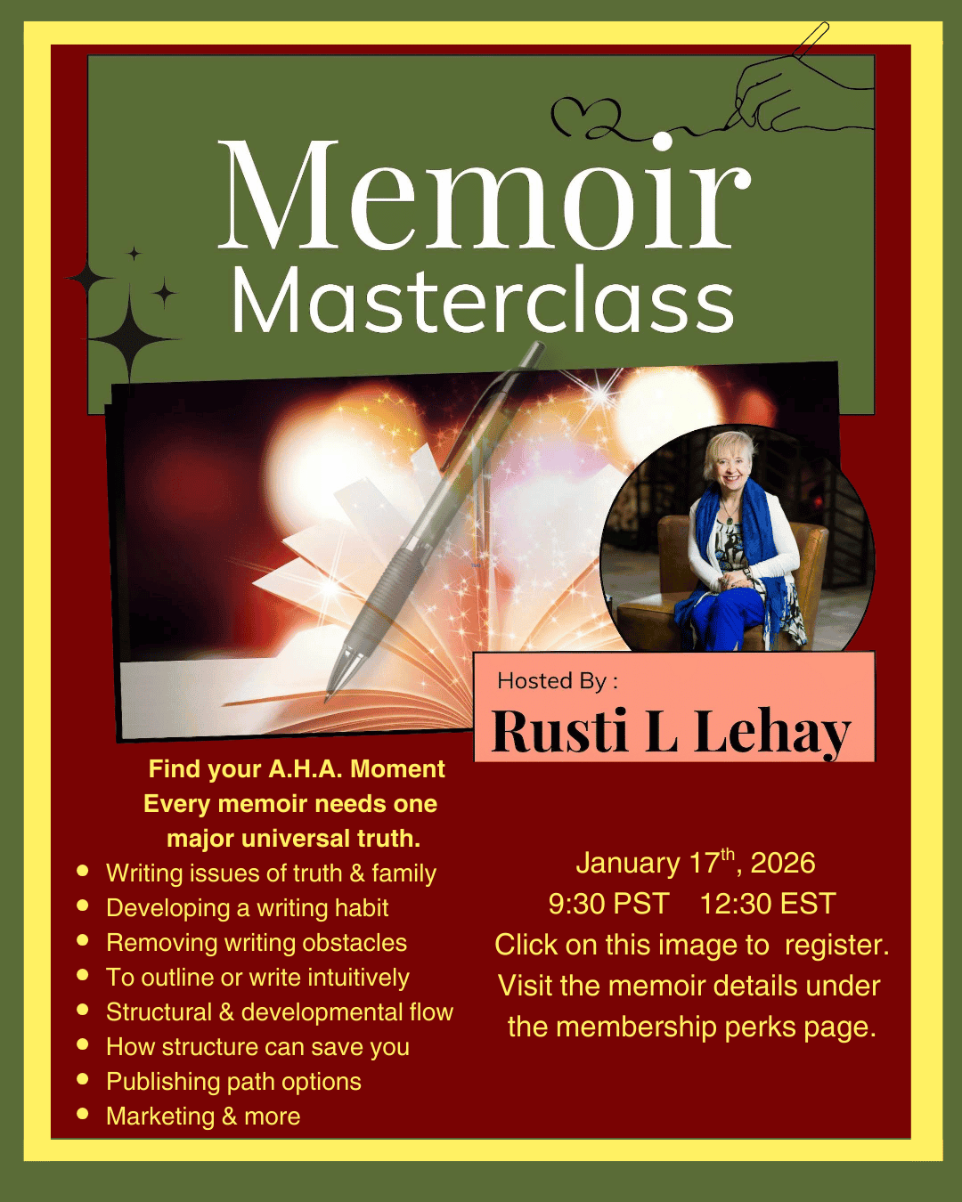 Topics: Finding the A.H.A moment that forms the core of your memoir, guides you to your outline and gives you a premise to build upon. Plus the seven mistakes every writer makes.