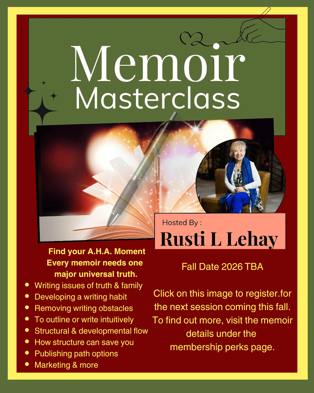 To register for the next Free Memoir Masterclass in the fall of 2026, please click here. In this session, you can plan your memoir and may choose to carry on independently. You will also find out more about