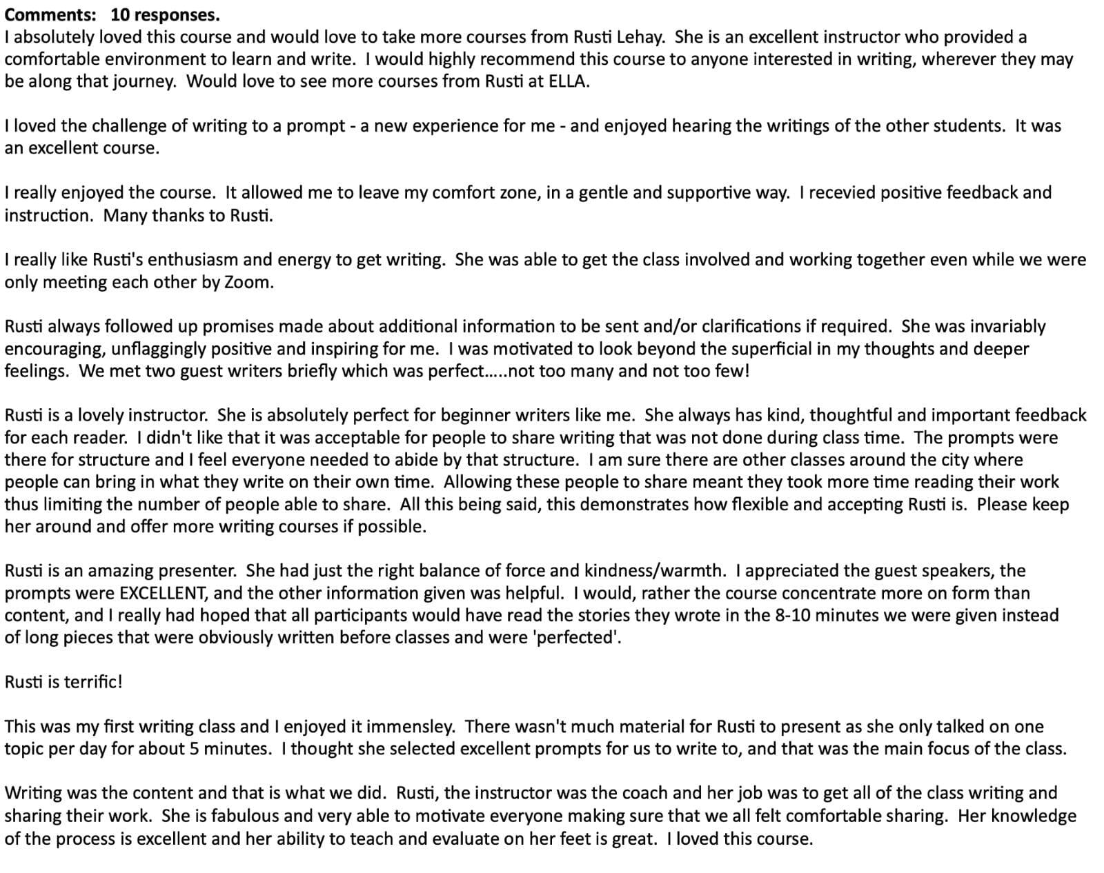 I am a published writer whose creativity needed a kick-start, and Rusti Lehay’s creative writing class, did just that. Rusti has created an atmosphere of acceptance and of positive feedback that allows us all to feel confident in workshopping new pieces of writing, such as prose, poetry, monologues, dialogues, etc. I have made new friends since attending these classes over the past five months and have renewed my love of words and writing.